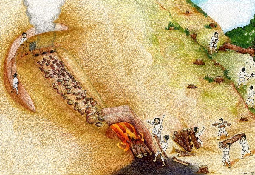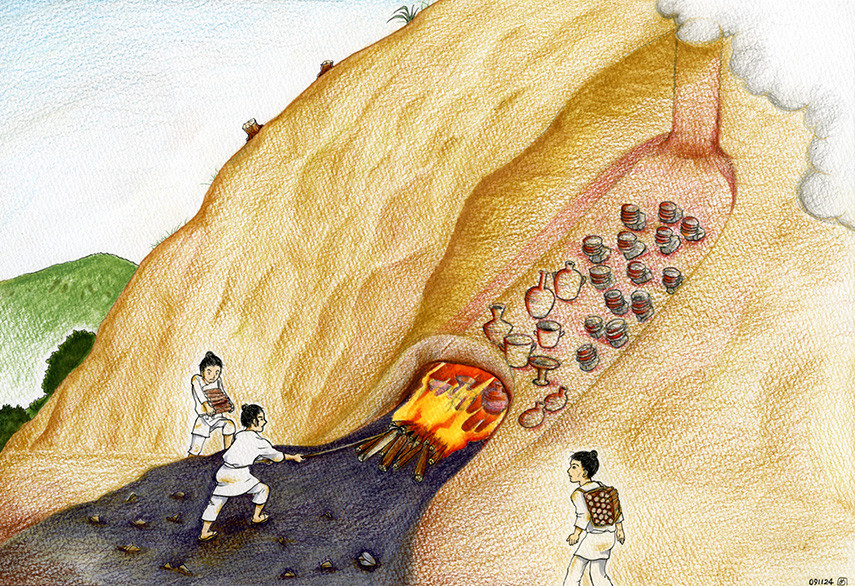 Kilns with perforated flues and multiple chimneys were also built at the Ushikubi Sue Ware Kiln Ruins from the end of the 6th century to the first half of the 7th century, a structure also seen in tile kilns on the Korean Peninsula. Kilns with the same structure as those built in the Munakata area of northern Fukuoka Prefecture from the latter half of the 7th century have also been observed. The shape of these kilns is a crucial clue to understanding where the workers who fired Sue ware pottery came from.