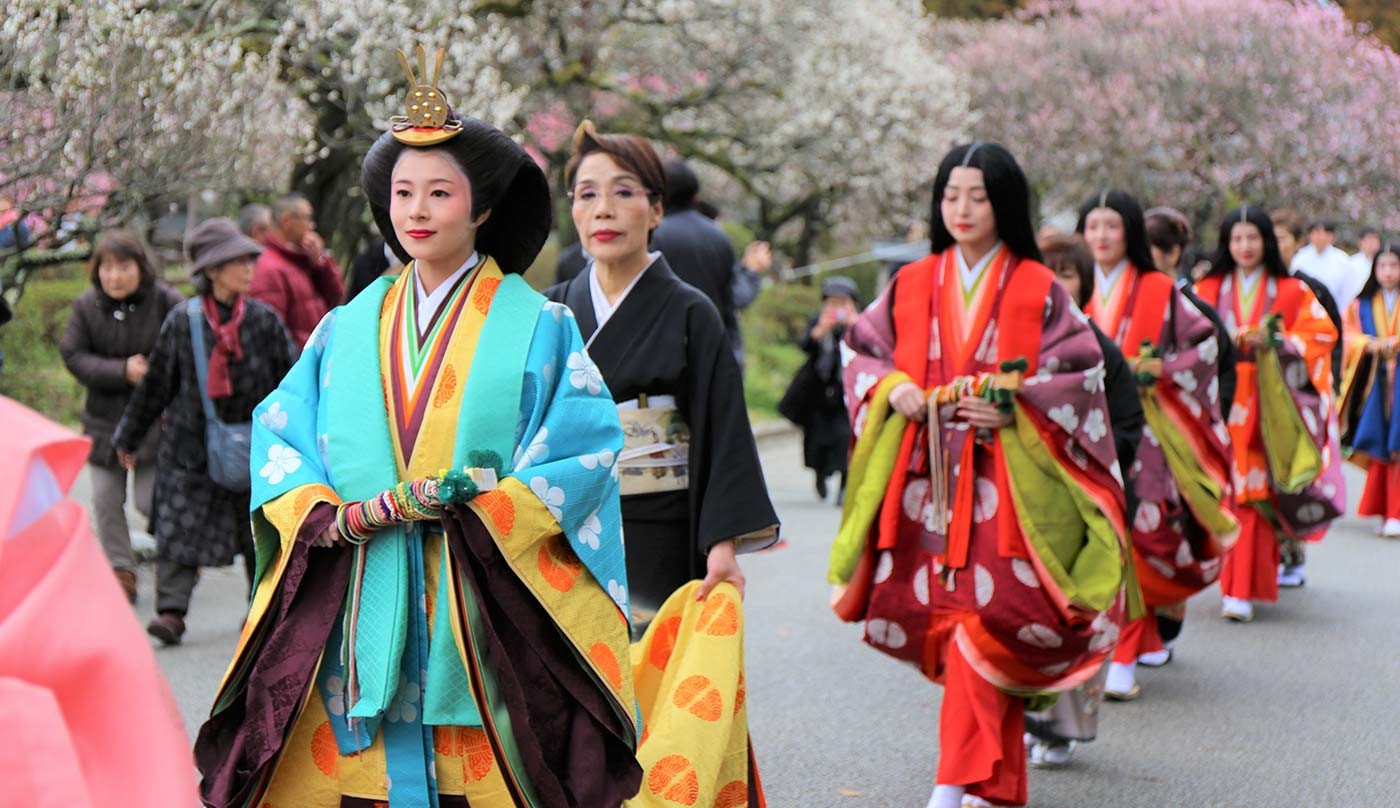 曲水の宴は、3月の第1日曜日に行われる行事です。衣冠束帯(いかんそくたい)、十二単(じゅうにひとえ)と、平安時代の正装をした人々が、曲水のほとりに座り和歌を詠む、春の風物詩です。