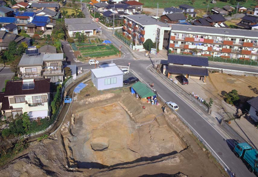 なお、官道(西門ルート)を見下ろす高台にある玖岡本遺跡盤石地区では7世紀後半から8世紀の瓦をともなう掘立柱建物跡が2棟、発掘調査されています。眼下を通過する官道と建物跡との関係性が注目されます。