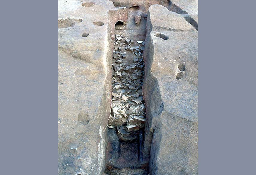 ウトグチ瓦窯跡は7世紀後半に操業した瓦専用ののぼり窯で、2基の窯跡が発掘調査され、多量の瓦が出土しました。軒先を飾る軒平瓦・軒丸瓦、大棟の両端に飾る鴟尾、棟の端に飾る鬼板瓦、平瓦・丸瓦など種類も多く、本格的な寺院建築を目的としたものです。近畿地方の瓦と共通した文様を持つことも特徴です。 1号窯本体の全長は約14m、幅1.4~1.8mです。瓦を焼くための焼成室は床面が階段状になっており、多量の瓦を効率よく焼くための工夫がされています。煙を出す煙道は3つに分かれていますが、これは牛頸窯跡群の特徴です。また、山の斜面にある窯跡どうしをつなぐ溝状の作業用通路も確認されています。