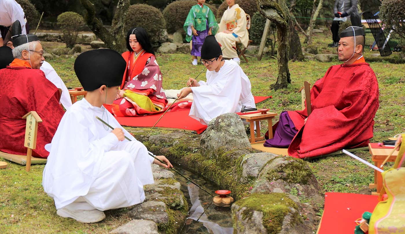 곡수 연회는 3월 제1 일요일에 행해지는 행사입니다. 의관속대, 주니히토에(여성 정장)과 헤이안시대의 정장을 한 사람들이 곡수 옆에 앉아 시조를 읊는 봄의 정취입니다.