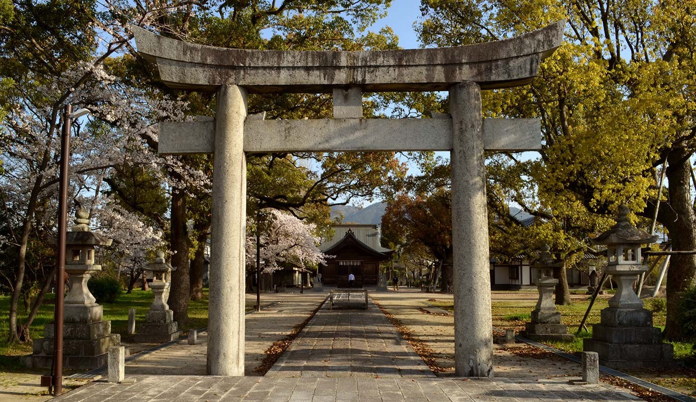다치(館)는 도성에서 부임해 온 사람의 관사이며 이 중 ‘남관’은 스가와라노 미치자네(菅原道真)가 귀양한 곳으로 알려져 있습니다. 그 후 미치자네를 애도하여 다자이후 차관(大宰大弐)이었던 후지와라노 코레요리(藤原惟憲)가 1023년에 조묘인(浄妙院)을 건립하고, 1101년에는 다자이후의 장관 대리(大宰権帥) 오에노 마사후사(大江匡房)에 의해 조묘인과 텐만구를 연결하는 진코(神幸) 행사가 시작되었습니다. 이 장소는 지금까지 이어져 ‘에노키샤(신사)’가 되었습니다. 근처에는 객관 유적이 있고 주작대로 주변의 분위기를 느낄 수 있는 곳입니다.