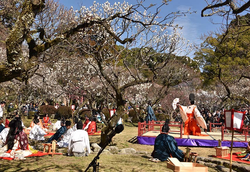 曲水宴是在3月的第1個週日所舉行的活動。人們穿著衣冠束帶和十二單等,平安時代的正式服裝,坐在曲水的岸邊吟詠和歌,成為春天的風情畫。