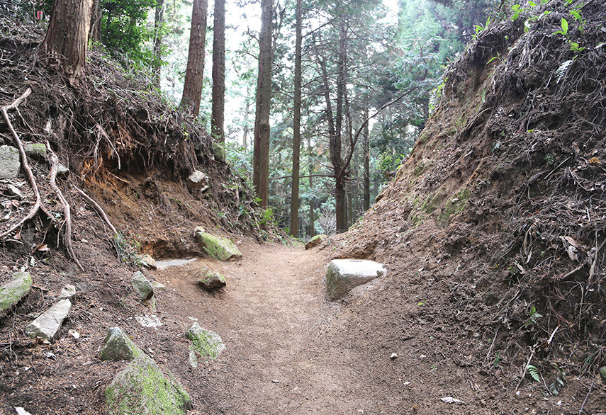 Kii-jo Mountain Fortress were once an ancient mountain fortress built on the eastern peak of Mount Kizan located south of Dazaifu, and with earthworks such as those at Sekiya and Toregi built at the base of the mountain, it is believed to have protected Dazaifu to the south. The earthworks were used as fortress walls stretching 4 km long, and there are the ruins of the fortress gate, the water gate, and the cornerstones of nearly 40 buildings left behind. The southernmost water gate is built with one of the longest water ditches among all ancient mountain fortress, and three smaller water ditches have been discovered alongside it. Many warehouses were built during the Nara period, and the role of the fortress started to change into a place to stockpile rice and other grains in preparation of famine or disaster, and it also began serving as a place of cultural exchange, with the Governor-general of Dazaifu Otomo no Tabito ascending to the top of the fortress in early summer with officials from Dazaifu or the capital to exchange poems.