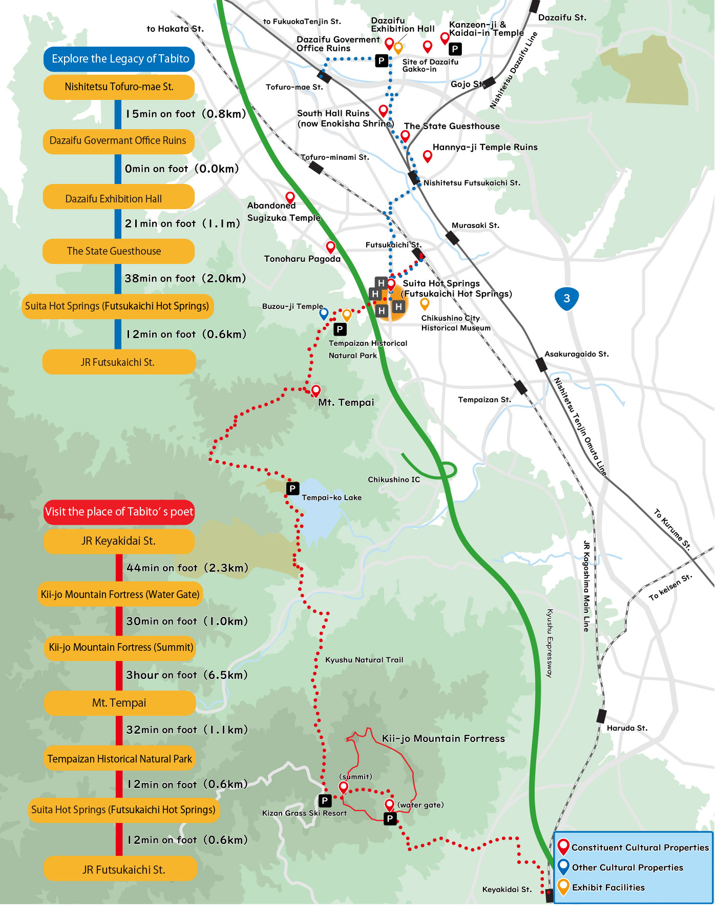 Soon after his appointment as governor, Tabito suffered the loss of his long-time companion and beloved wife, Iratsume. Grieving deeply, Tabito sought refuge south past the Suzaku Avenue at Suita no Yu (now Futsukaichi Onsen), where he penned verses lamenting his late wife and found solace in the soothing hot springs. He also took visitors like Isonokami no Katsuo to the Kii-jo Mountain Fortress, where he entertained them with heartfelt verses as they took in the panoramic views of the plains below.