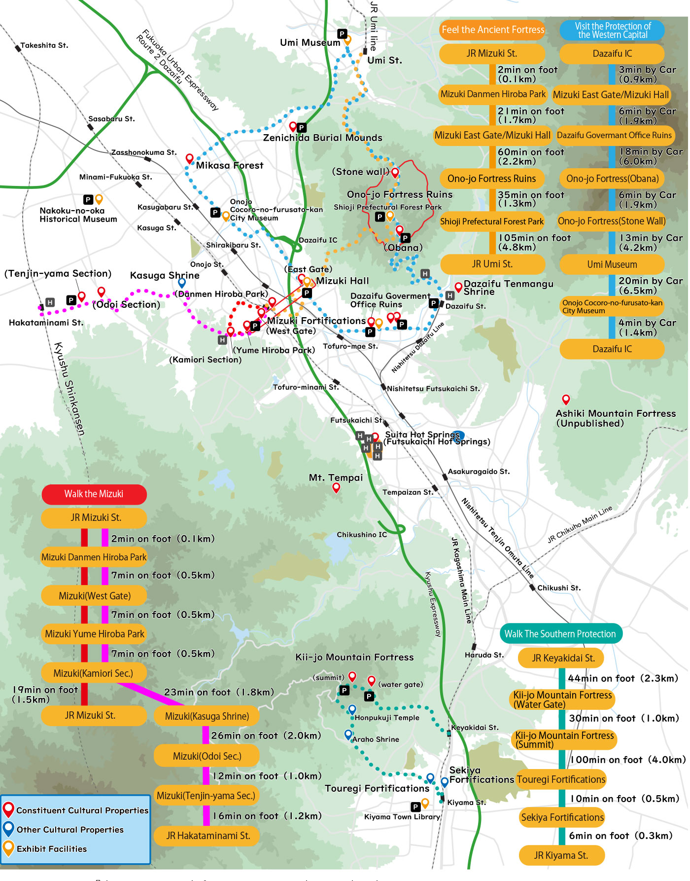 In the year 663, Japan dispatched reinforcements to aid the ancient Korean kingdom of Baekje. However, at the Battle of Baekgang, they suffered defeat against the combined forces of the Tang and Silla, leaving Japan vulnerable to invasion. In response, a series of earthen ramparts and moats called the Mizuki Fortifications were built the following year to fortify the northwest expanses of plains. Further defenses were constructed in the form of mountain fortresses, with Ono-jo to the north and Kii-jo to the south. With further strategically placed earthen ramparts and natural obstacles, they created a defensive complex capable of defending the region against potential enemies landing by sea.