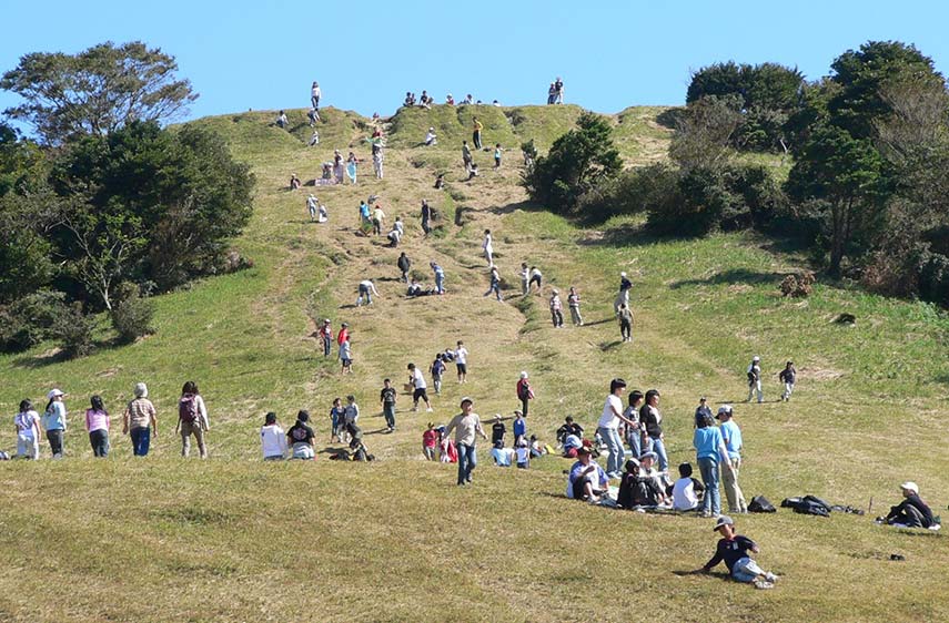 In the spring and fall, visitors can enjoy grass skiing down the slopes using wooden sleds. Grass skiing in Kiyama is mentioned in a document from 1938, meaning this has long been an important part of tourism in Kiyama. The poem from the Man'yoshu posted at the grass ski resort is said to have been written by Otomo no Tabito upon visiting Kii-jo Fortress.