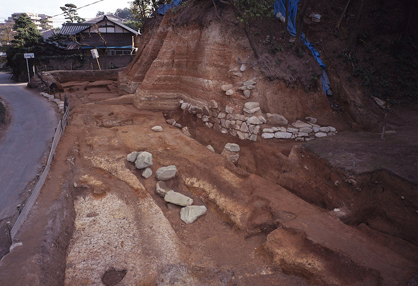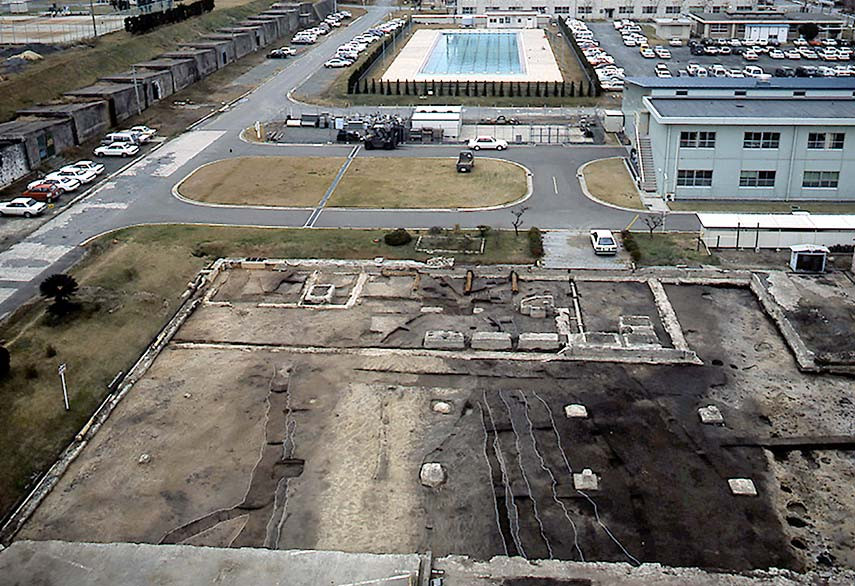 なお、官道(西門ルート)を見下ろす高台にある玖岡本遺跡盤石地区では7世紀後半から8世紀の瓦をともなう掘立柱建物跡が2棟、発掘調査されています。眼下を通過する官道と建物跡との関係性が注目されます。