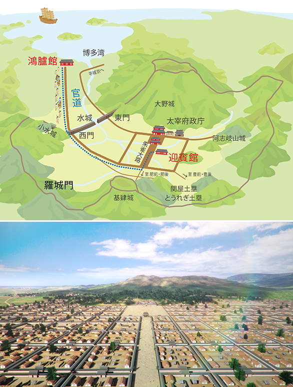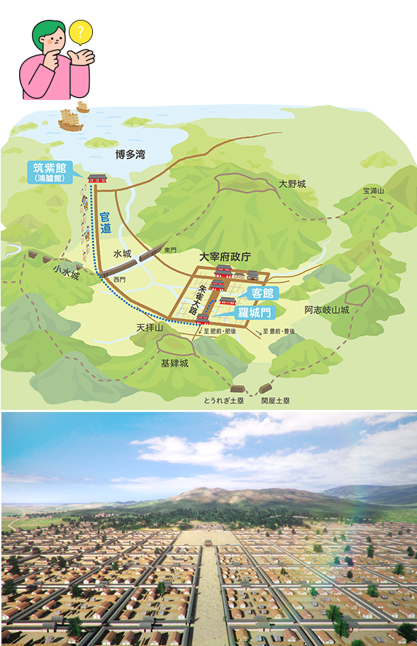 およそ1300年前、奈良の都から遠く離れた九州には、九州をおさめ、外国との交流や、国境を守る役目をもった「大宰府」という役所がおかれました。大宰府は、水城、大野城、基肄(きい)城などのお城でまわりをかこみ、その内側に中国の唐の都を手本にして、きれいに区画されたまちがつくられました。まちには、役所だけではなく、役人を育てる学校、外国の使節をむかえる館、大きな寺、人びとでにぎわう市場などがあり、まさに、古代日本の「西の都」でした。