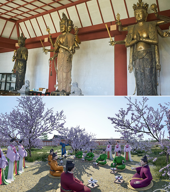 「西の都」には、文化や学問に優れた人びとも集まり、和歌をよんだり、宮廷と同じ行事が行われたりしました。また、外国から伝わった舞に使うお面や、優れた技術でつくられた仏像のほか、東アジアの国々から貴重な品々も集まってきました。今も、太宰府周辺には、東アジアとの交流でにぎわった「西の都」大宰府にかかわる文化財がたくさん残っています。