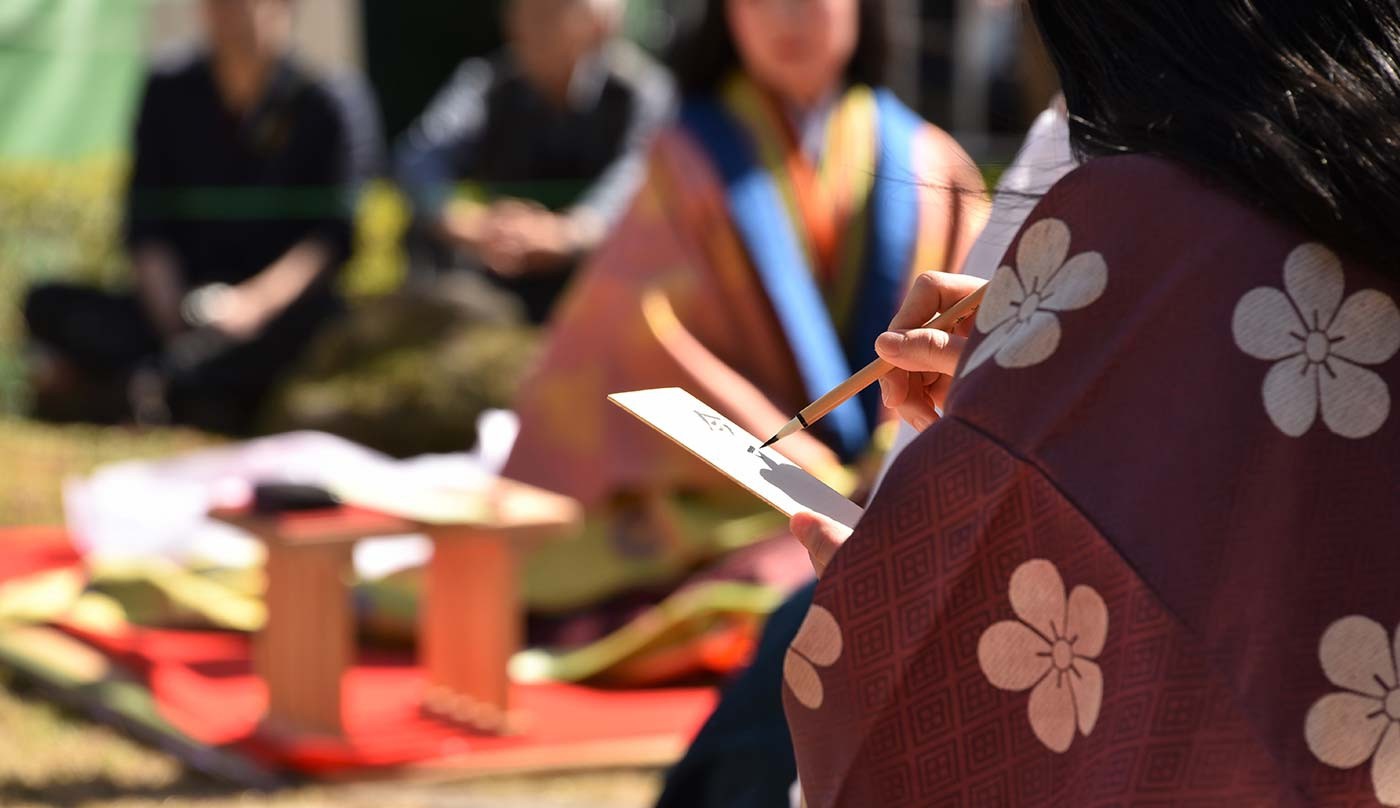 곡수 연회는 3월 제1 일요일에 행해지는 행사입니다. 의관속대, 주니히토에(여성 정장)과 헤이안시대의 정장을 한 사람들이 곡수 옆에 앉아 시조를 읊는 봄의 정취입니다.