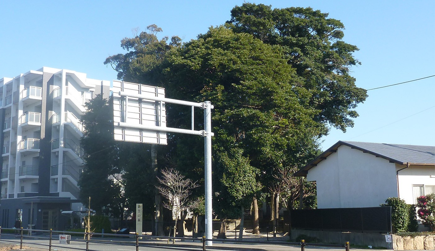 일본 최고 역사서 ‘일본서기’에는 진구황후가 호족을 토벌하러 가는 도중에 회오리바람이 불어 황후의 삿갓이 날아가 그 땅을 ‘미카사’(미카사군)으로 불리게 되었다고 전해집니다. 또한 에도시대의 ‘지쿠젠국 속풍토기’에서는 바람에 날아간 황후의 삿갓이 이 숲의 나무에 걸리고 걸린 삿갓을 잡을 수 없어 숲의 신에게 가져다 달라고 할 수밖에 없다고 생각해서 숲 앞의 논에서 춤을 봉납하니 삿갓이 나풀나풀 내려왔다고 전해지고 있습니다. 현재 주택지로 둘러싸여 있지만 전쟁 전까지 수전 지대 속 고도와 같은 경관으로 고대에는 바로 근처에 관도가 있었습니다.