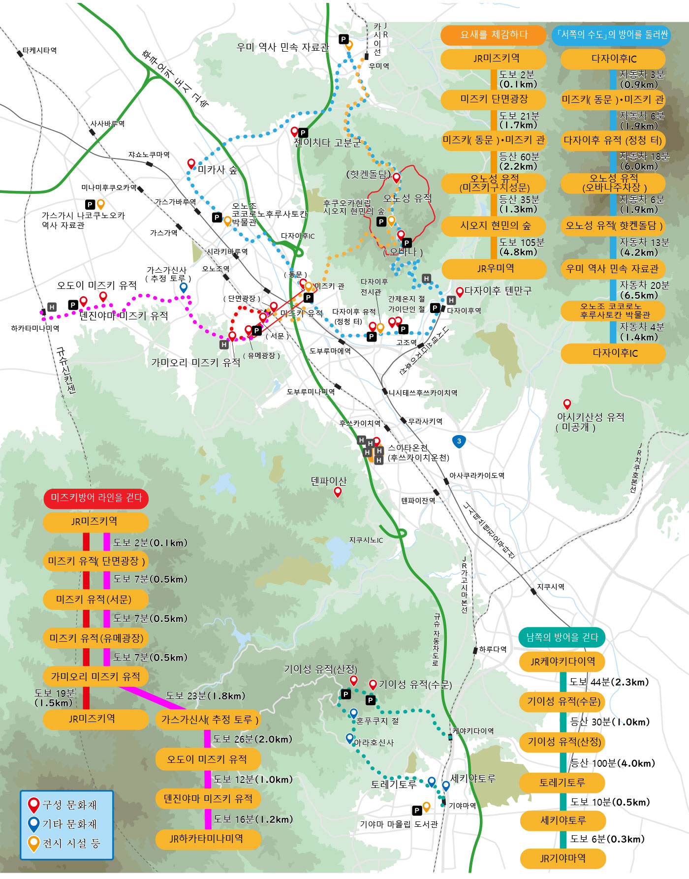 663년, 백제를 구원하기 위해 향했던 일본은 백촌강(白村江) 전투에서 나당연합군에게 대패하고 외국으로부터의 위협을 받게 됩니다. 전투 이듬해, 웅대한 토루와 해자로 이루어진 미즈키(水城) 성을 쌓고 북서쪽으로 펼쳐진 평야를 차단하고, 이 성벽과 이어지는 요새로서 북쪽에 오노성(大野城), 남쪽에 기이성(基肄城)을 쌓아, 곳곳에 쌓은 토루와 자연 요새로 주위의 수비를 다졌습니다. 바다로부터 상륙하는 적에 대비해 사방에 방어선을 만들어 요새화를 꾀한 것입니다.