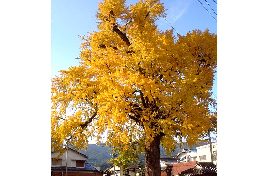 높이 약 26m, 나무 둘레 약 5.3m의 고목은 마을에 있는 은행나무 중 가장 크고 시지정 천연기념물입니다. 구의 심벌마크는 은행잎이며 단풍이 들 때에는 라이트업되는 등 많은 사람들에게 사랑받고 있는 명목입니다.