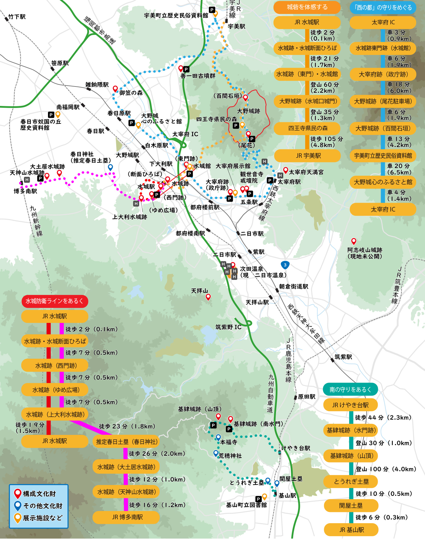 「西の都」成立以前の7世紀後半、東アジアの動乱の中、防衛の最前線となった筑紫には、山城や土塁による防衛線を巡らせた巨大な要塞が出現しました。“いにしえの要塞”を巡ると、激動の時代から豊かな交流の時代への移ろいを体感できます。