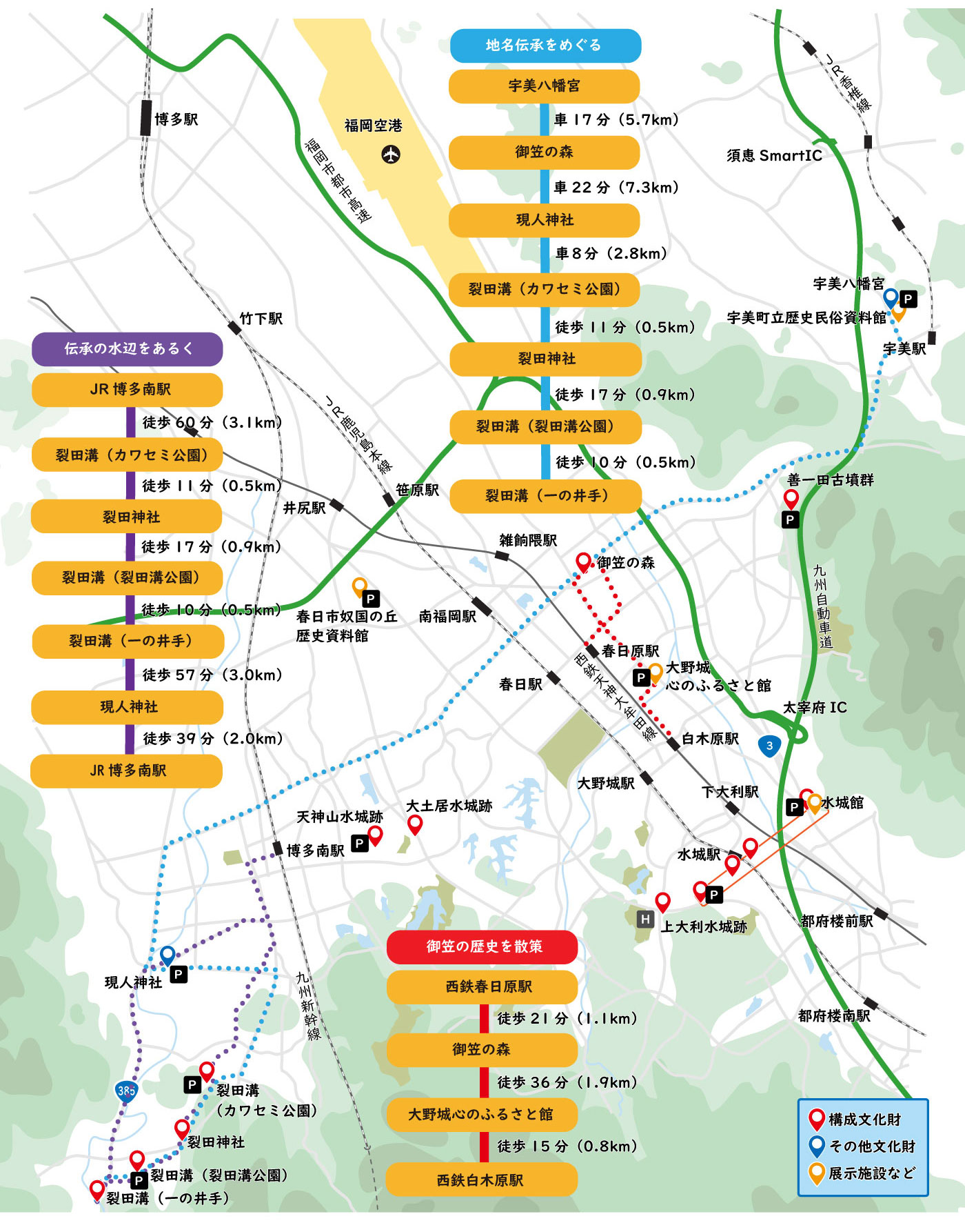 現存する日本最古の歴史書の一つ『日本書紀』や、現存する最古の歌集『万葉集』には「西の都」にゆかりのある記述が多く残されています。中でも神功皇后に関わる逸話には、今も地名として残されているものがあります。神功皇后が香椎宮から松峡宮(現在の朝倉市)へと遷る道中、皇后がかぶっていた笠がつむじ風で飛ばされたその地を「御笠」、笠がかかった森を「御笠の森」と呼ぶようになったと記されています。古代の大宰府は「御笠郡」にあり、宝満山は「御笠山」と呼ばれていました。梅花の宴に出席した大伴百代もこの地名伝承を踏まえ歌を詠んでいます。「西の都」の時代から今も流れ続ける用水路、裂田溝には「神功皇后が神に祈りを捧げるため、神田に儺河(那珂川)の水を引こうとしたところ、雷が落ち、行く手を塞いでいた大岩が裂けて水が通った」とする伝承に基づき名づけられたとされています。現地にはこの伝承を彷彿とさせる場所が残されています。やがて、神功皇后は筑紫の「蚊田」で応神天皇を産み、その地を「宇美」と名付けます。安産の神として知られる宇美八幡宮の境内には「蚊田の森」と呼ばれる楠の森があり、多くの人びとに親しまれています。