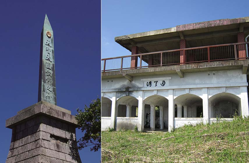 「特別史跡基肄城碑」北側の高台にあり、遠くに博多湾を望む展望所。ここには「天智天皇欽仰之碑」建立の際の募金によって建てられた、ギリシャ神殿風の建物がありました。老朽化のため昭和60年に解体され、現在は基礎の名残と方位板を見ることができます。