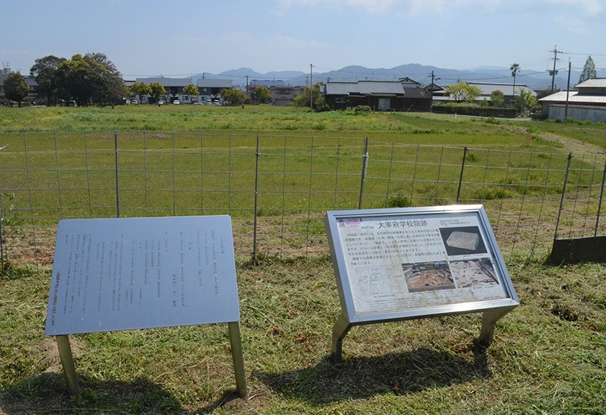 这是设置于大宰府的、用来培养官员的机构遗址。西海道(今九州地方)各国的郡司子弟都曾经在这里学习。这里曾存有吉备真备从唐朝带回的孔子肖像,大宰权帅大江匡房将这段史实记载在《江家次第》中。现在,沿着县道种植的树木源于孔子后人转让的,在孔子庙中代代相继的櫂树种子(在2015年夏天的台风中,3棵中有2棵折断)。