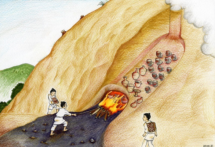 在牛颈须惠器窑炉遗址中,所烧制的不只有须惠器而已。从6世纪末~7世纪上半叶,这些烧制的砖瓦被运送到推测是那珂・比惠遗址群,作为迎接外交使得的建筑物屋顶装饰。此外,从7世纪末开始,制造了各种类型的砚台,到了8世纪,制造了许多大宰府官员使用的圆形砚台,支持着大宰府的政务。 须惠器和砖瓦等,是在名为「穴窑」的登窑中烧制,该窑是透过挖掘山坡,所形成的隧道状地形。窑的形状和大小会随着时代而变化,一般认为,它会根据制作的须惠器类型和大小而改变。 牛颈须惠器窑遗址引领了九州的须惠器生产作业。