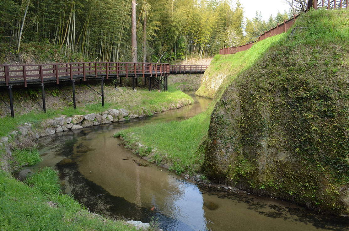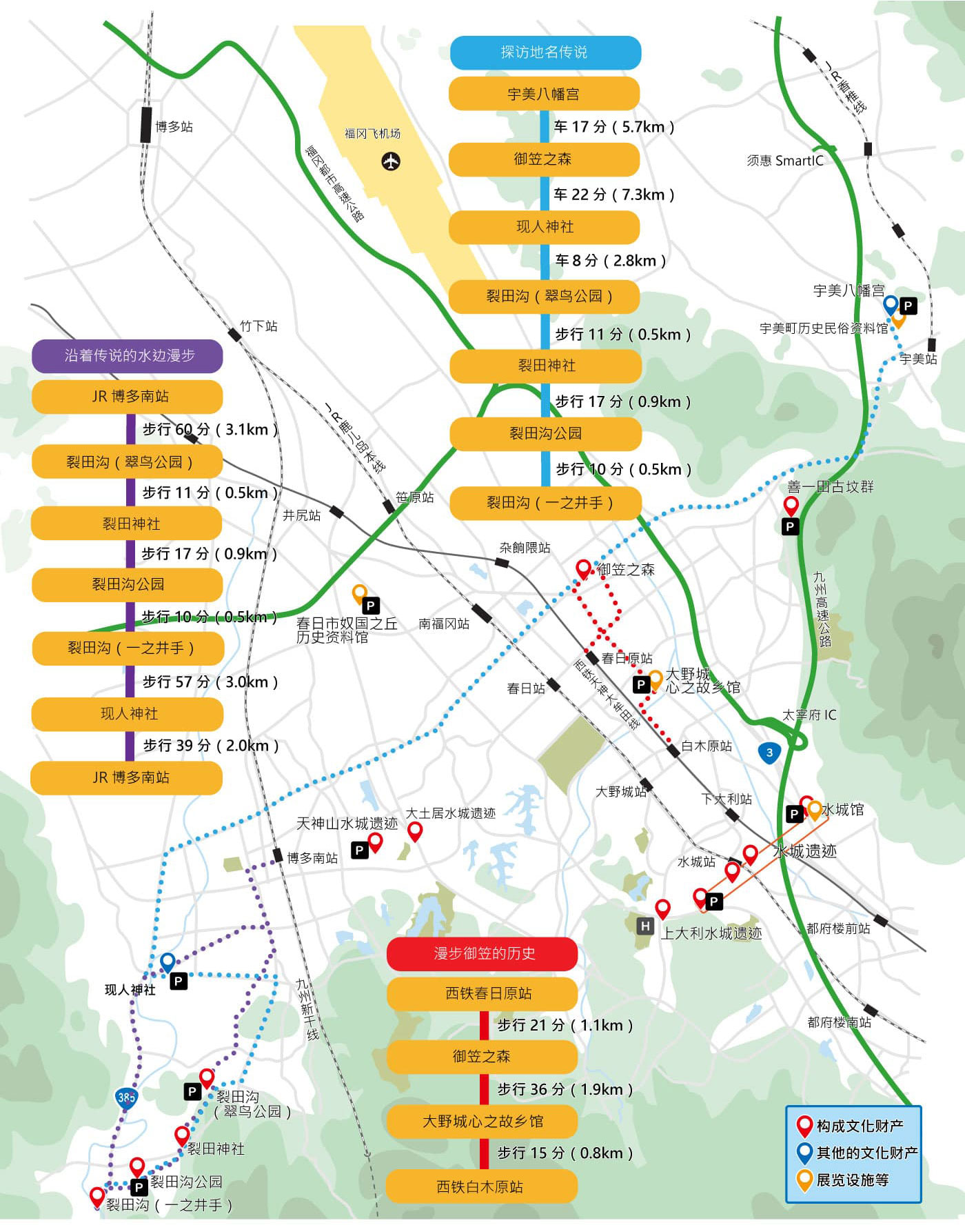 裂田沟是一条至今还在流淌的灌溉水路,据说,神功皇后试图从傩河(那珂川)引水到神田祈求神灵时,雷电交加,挡住她去路的一块大石头裂开,水流得以通过,裂田沟因这一传说而得此名。 最后,神功皇后在筑紫的“蚊田”生下(日语罗马拼音为Umu,与“宇美”发音一致)了应神天皇,并将此地命名为“宇美(Umu)”。 宇美八幡宫被称为安产之神,宫内有一片樟树林,被称为“蚊田之森”,深受人们喜爱。