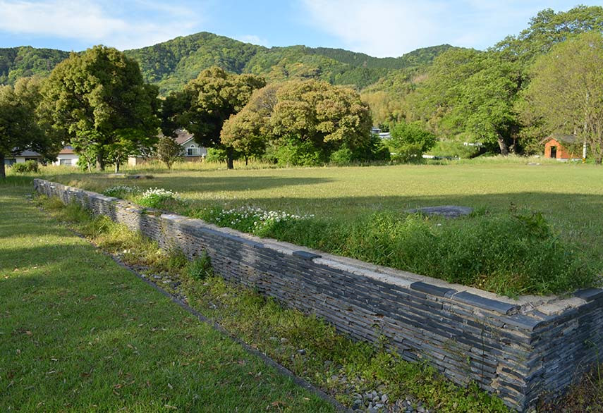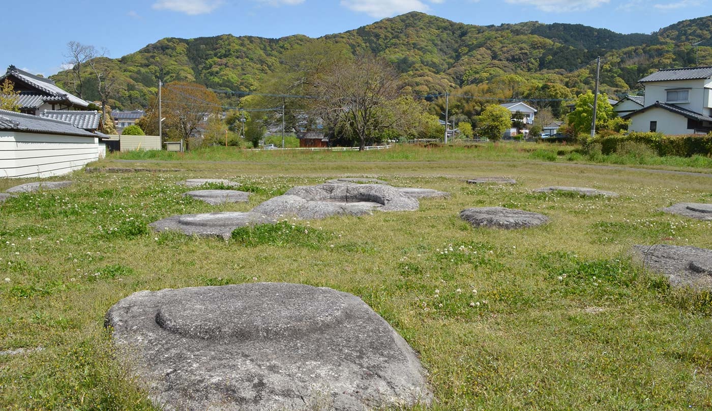 從這裡開始,往西步行3分鐘,即可抵達築前國分寺遺址。經過維護,可以看出建築物的位置所在。在塔的遺址,仍然保留著曾經是七重塔支柱的巨大礎石。